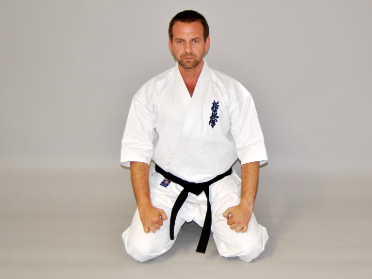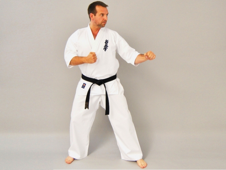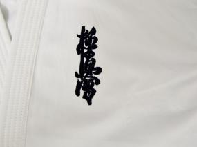 Jacke aus 12oz gebürstetem Segeltuch, sehr stabil, trotzdem angenehm zu tragen, reinweiß, auf der linken Brustseite bestickt mit dunkelblauem "KYOKUSHINKAI"-Logo. Die Ärmel sind im KYOKUSHINKAI Stil kurz gehalten. Hose aus 8oz Twillgewebe, reinweiß gebleicht, normal knöchellang, mit traditionellem Zugbandverschluß