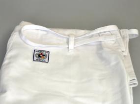 Jacke mit Reiskornstruktur, mehrfach verstärkt, Unterteil durchgewebt, 3cm breite Rückennaht, Hose mit Zugbandverschluss, Hosenbeine vom Knie abwärts verstärkt.