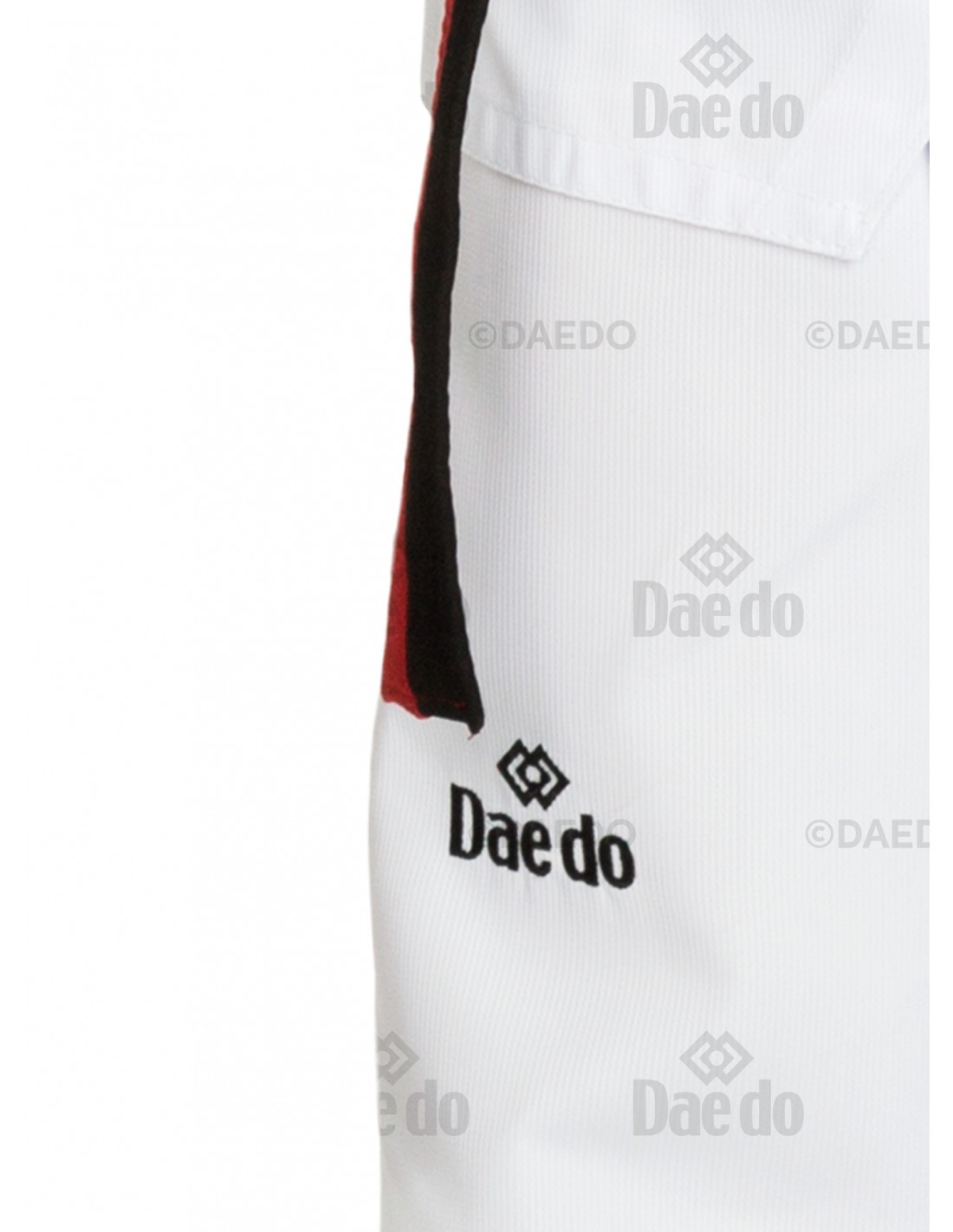 Jacke mit Taekwondo-Bestickung am Rücken. Hose mit 4cm breitem Gummibund und zusätzlicher Schnürung. Komplett ohne Gurt. Schwarz/roter Revers.
