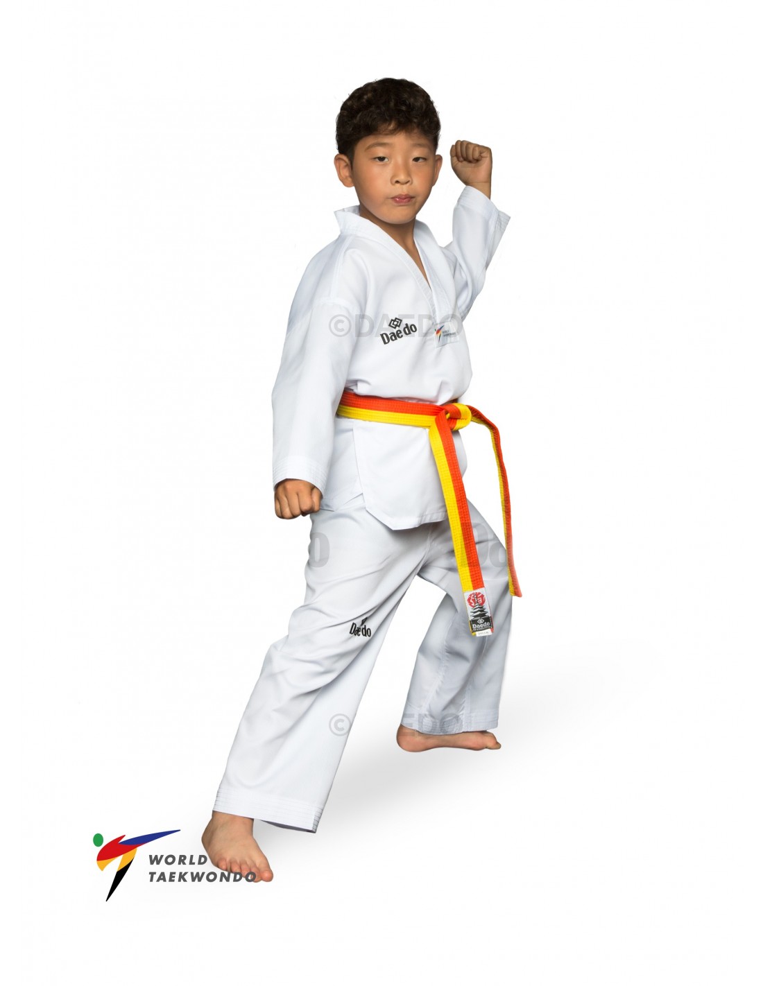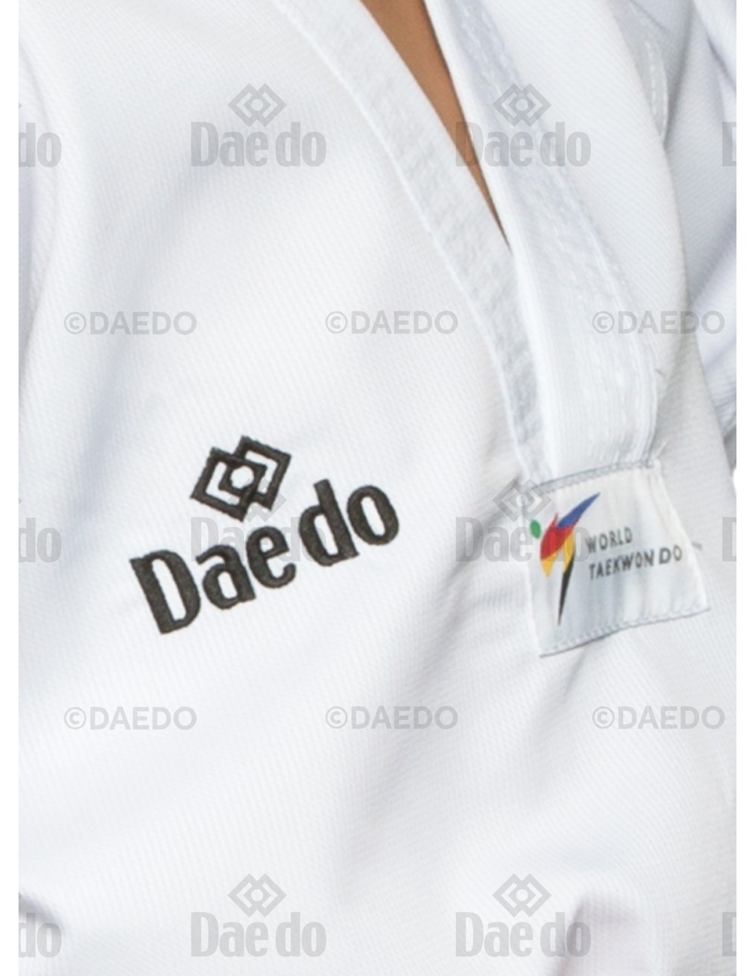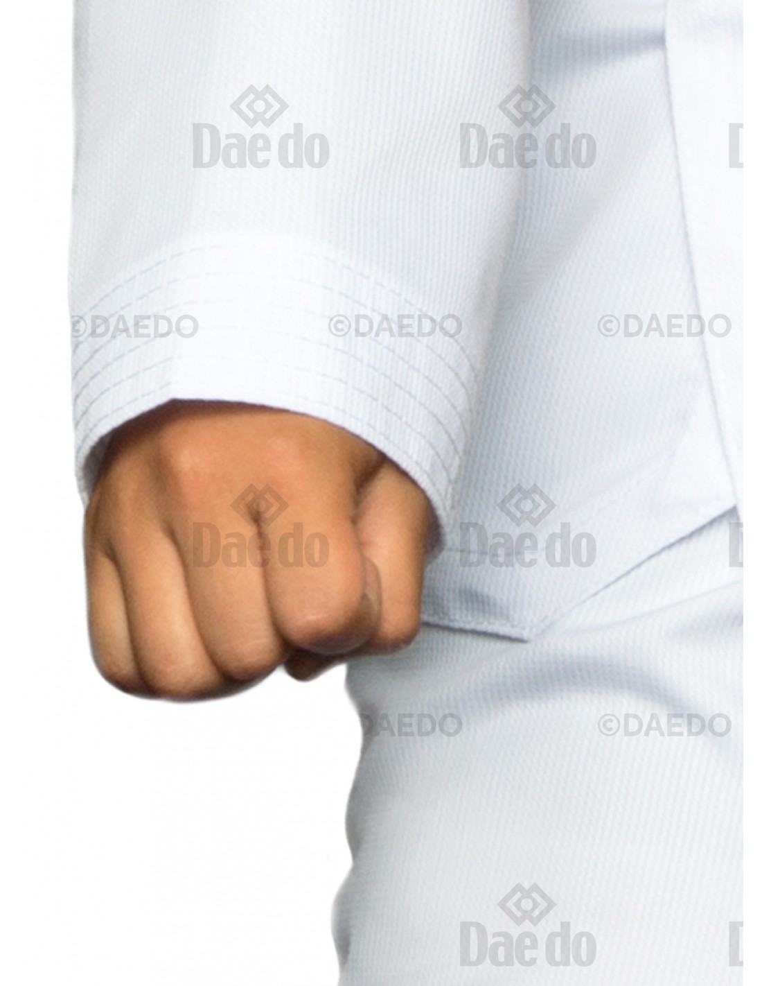Taekwondo-Anzug aus Kordstruktur-Material, 20% Baumwolle und 80% Polyester. Jacke mit Taekwondo-Bestickung am Rücken. Hose mit 4cm breitem Gummibund und zusätzlicher Schnürung. Modell mit weißem Revers. Komplett mit Jacke, Hose und weißem Gurt.