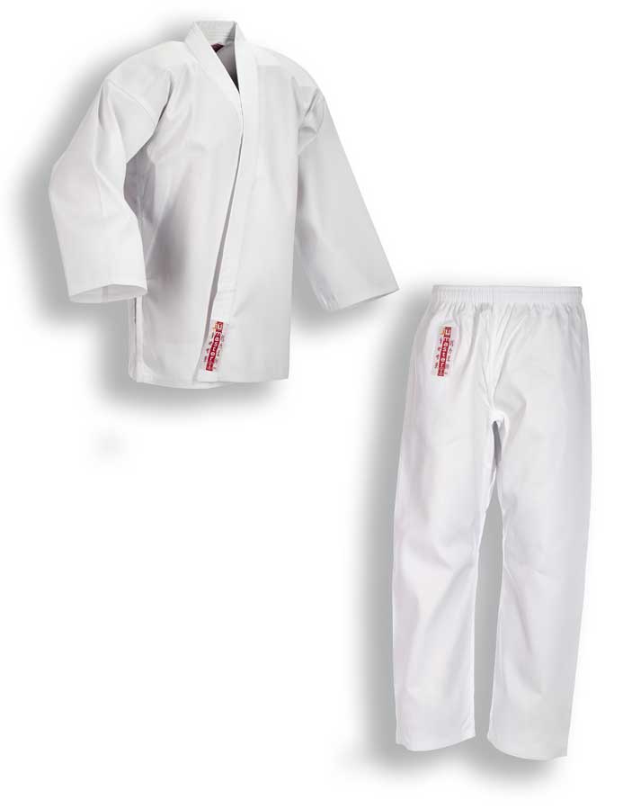Karateanzug aus 65% Polyester und 35% Baumwolle, gerippt, extra leicht für Karate Kumite. Kumite Schnitt, bequem und lang. Leichter 8 oz. Anzug für schnellste Aktionen im Wettkampf. Hose mit Gummibund und Zusatzschnürung.