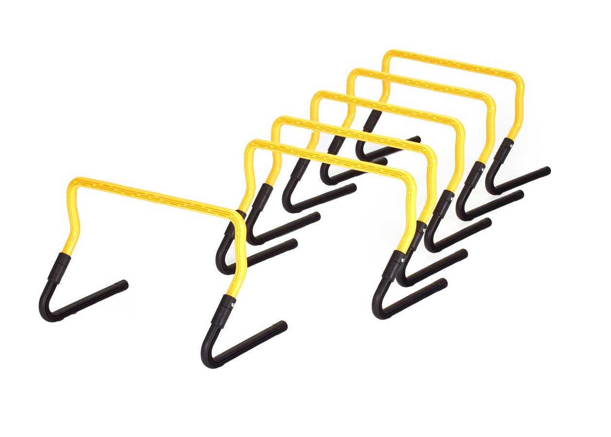 Kunststoff-Hürden-Set: die Hürden sind ca. 47 cm breit und auf vier verschiedene Höhen durch herausklappen der schwarzen Ständer verstellbar. Die Höhen: 9cm, 22cm, 28cm, 29,5cm. Die Hürden sind sehr leicht und perfekt für jedes Koordinationstraining geeignet.
