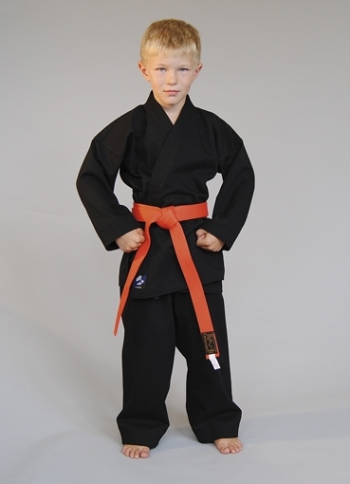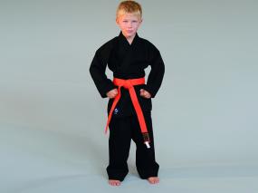 Leichter Einsteigeranzug aus 7,5 oz Mischgewebe (55% Polyester, 45% Baumwolle), schwarz, traditionelle Jacke, Hose mit Gummibund, weißer Gürtel beiliegend.