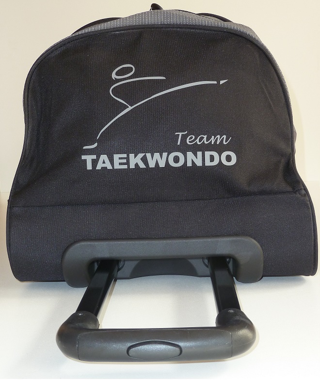Große Tasche mit Rollen und „TAEKWONDO“-Aufdruck. Perfekt für alle, die viel unterwegs sind oder Platz brauchen.