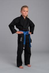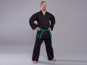 Schwarzer Universalanzug, traditionell, 100% Baumwolle, 8oz, 40° C vorgewaschen (d.h. Einlaufen nur ca. 3-5% bei 40%), bestehend aus Jacke, Hose mit Gummibund und weißem Gürtel